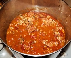 1. Soak dried black-eyed peas in water as directed on the bag (usually overnight), or at least 2-3 hours prior to cooking (if you like “crunchy” beans). Be sure to drain the beans in a strainer else you may get more “crunch” (and broken teeth) than you desire! (Years back, small rocks were present but less so now.) 2. Mix into the giant pot all ingredients except the rice … mix the beans, the ham (diced into dimensions that suit you, e.g., about 3/4″ square), the ham hocks, the canned tomatoes (including the water, and slicing the tomatoes in the pot), the tomato sauce, the onions (chopped), the Tabasco peppers (finely chopped), the salt, chili powder, and the almonds 3. Stir and add water as needed to cover the mixture 4. Cover & cook on low-medium heat for about 1 hour 5. Add the rice of your choice and continue cooking on low heat until the rice is done … around 1 hour; if needed, add more water 6. Eat (at least some on January 1) and/or Freeze … the mixture freezes and saves nicely 7. Other Things … cornbread is good but not required for good luck. |